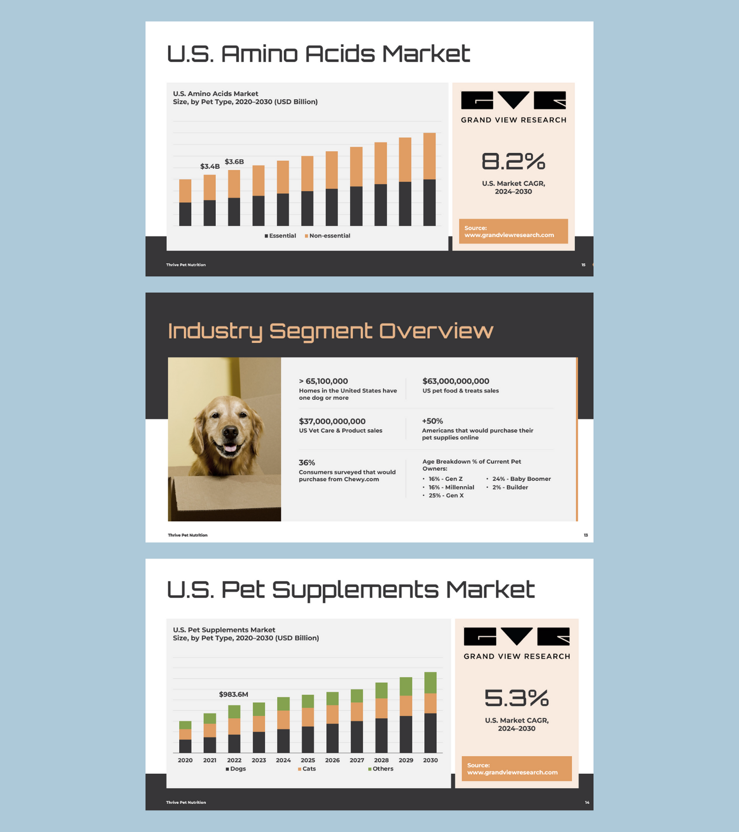 Welcome to Thrive Pet Nutrition’s Investor Relations page. Our mission is to revolutionize pet health with science-based, freeform amino acid supplements that enhance and extend the lives of our beloved pets. We are seeking the right partners to join us in this journey—those who share our passion for innovation, quality, and sustainability.