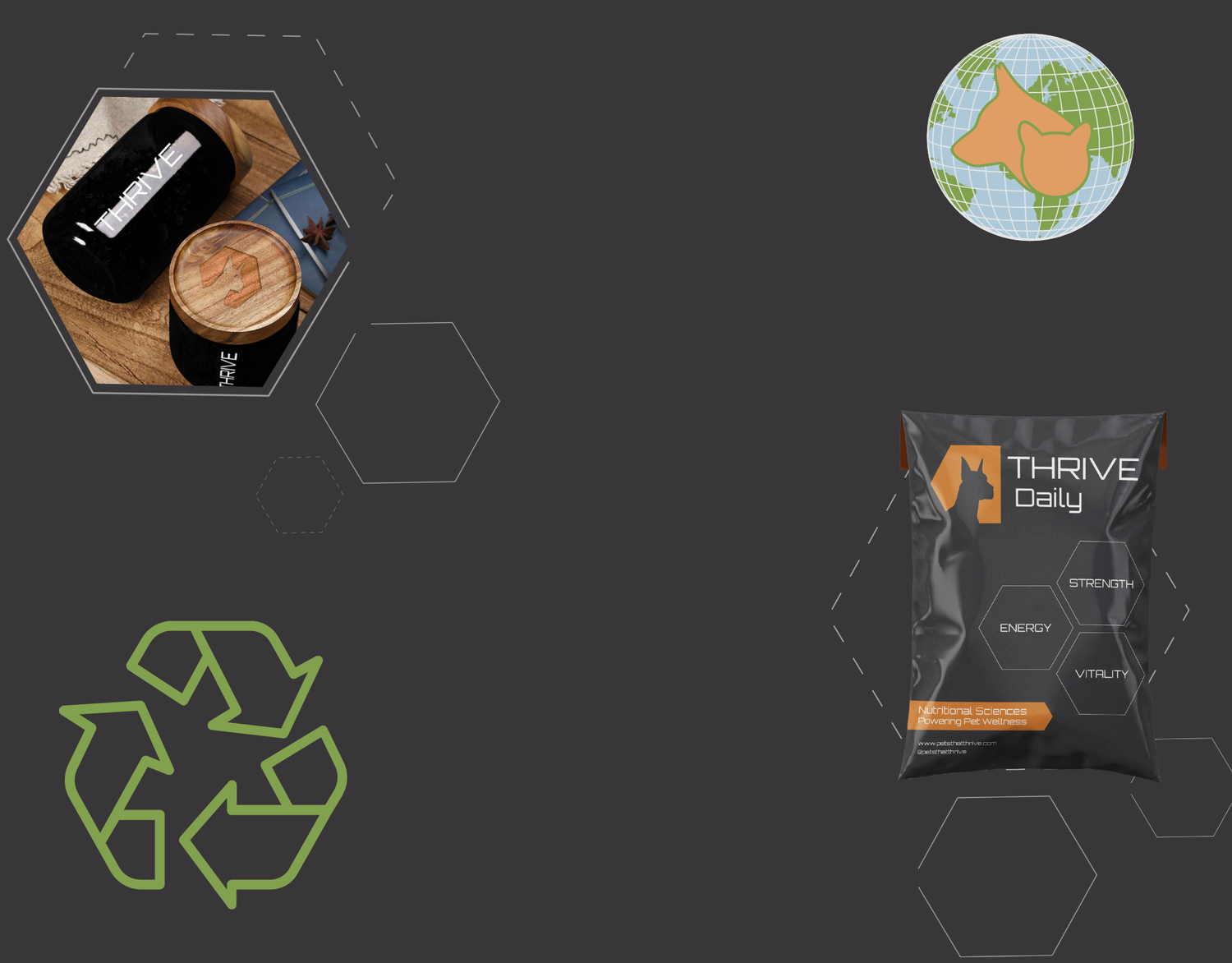 At Thrive Pet Nutrition, sustainability is at the heart of everything we do. We are proud to use plant-based pectin and eco-friendly, recycled packaging for our products. Our gusset bags, used for customer subscriptions, are made from Post-Consumer Recycled (PCR) films. This environmentally friendly packaging option reduces the need for virgin polymer by repurposing materials like milk cartons and water bottles into new packaging.
